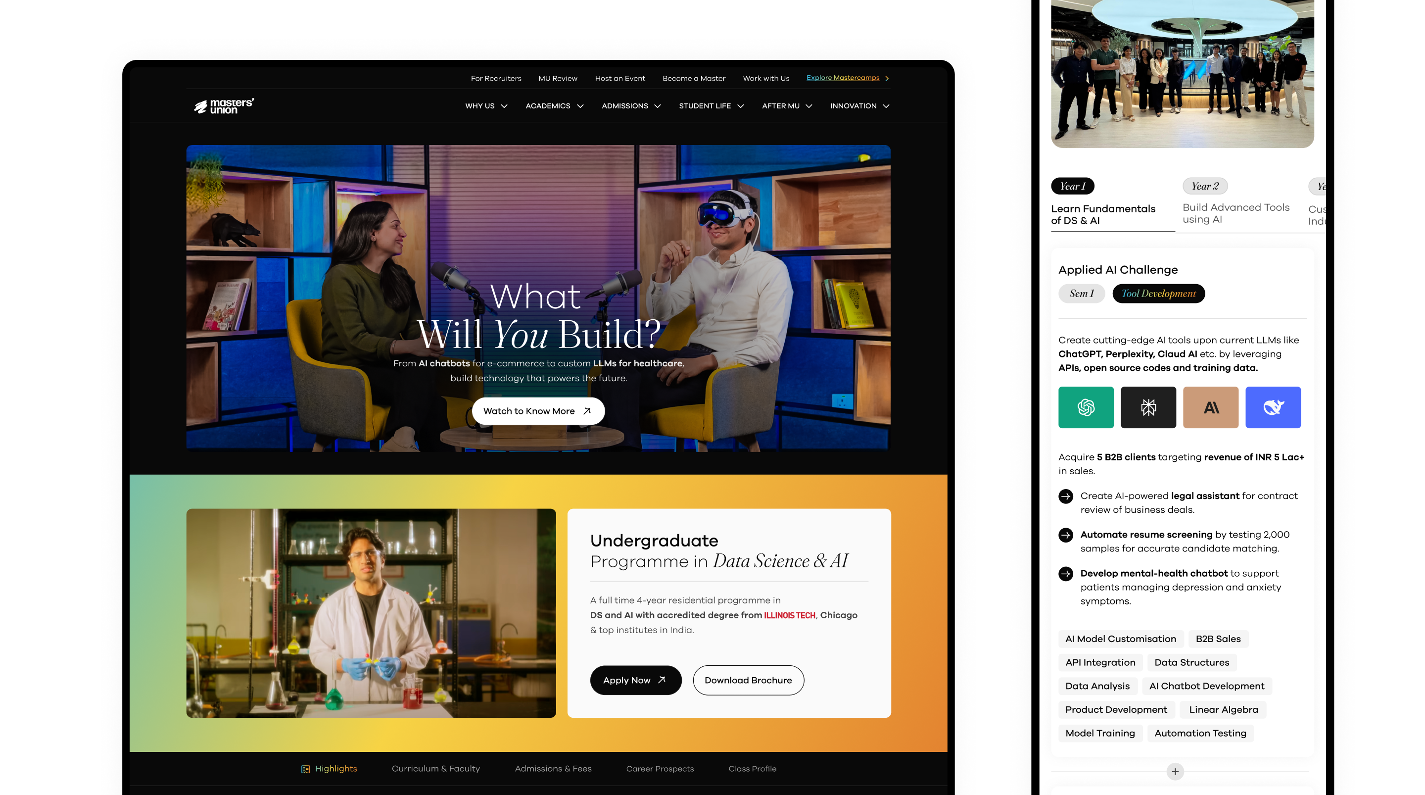 Reformat into three distinct sections that highlight the program’s USP, add video snippets or student stories and create a narrative that showcases how learning is applied in real-world projects.